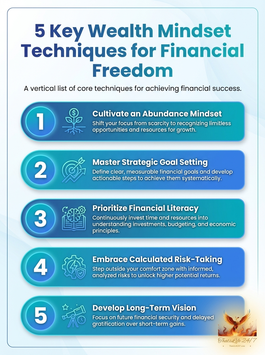This infographic highlights five key wealth mindset techniques to help you achieve financial freedom. Use these steps to shift your thinking and money habits.